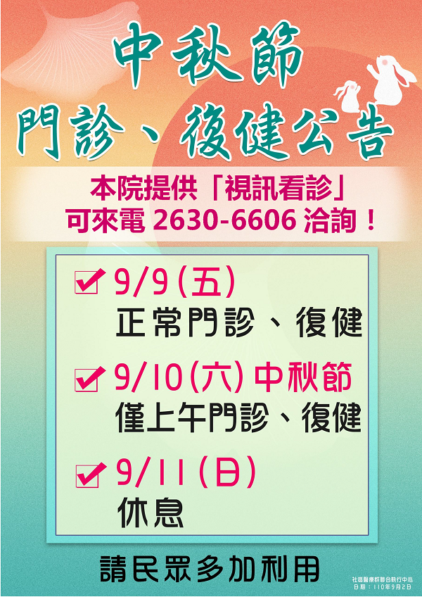 中秋連假門診時間公告