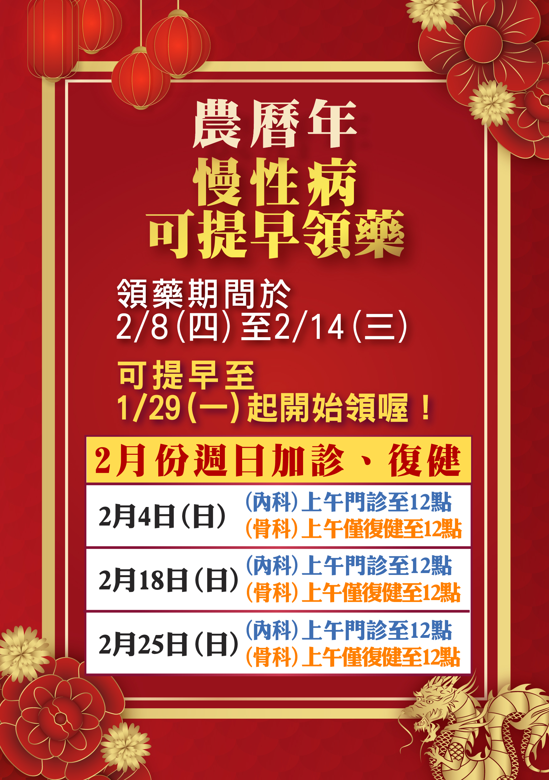 二月假日看診及提前領藥資訊
